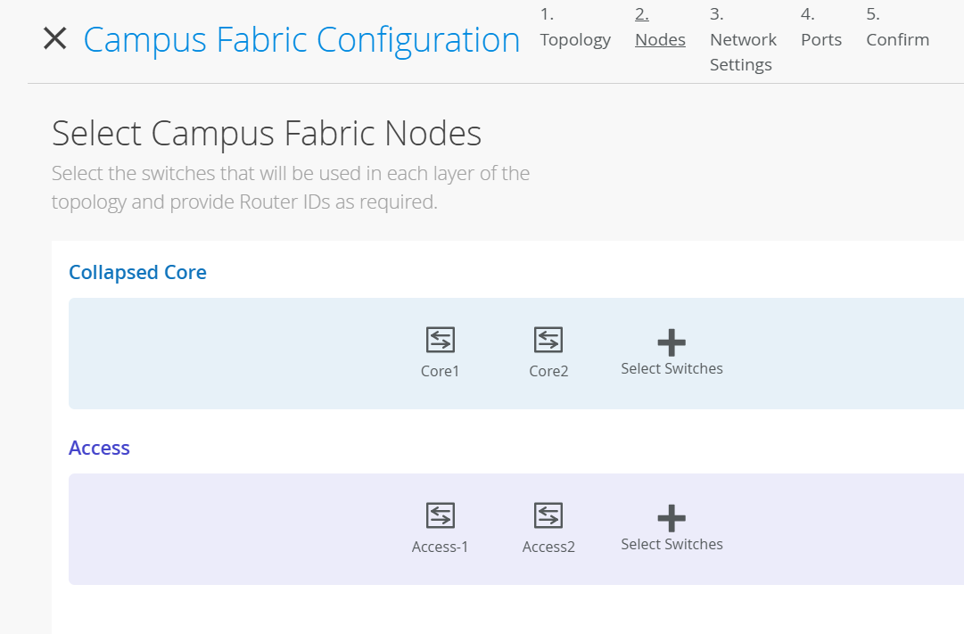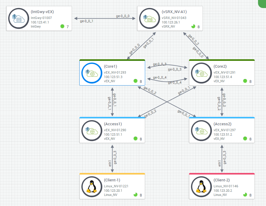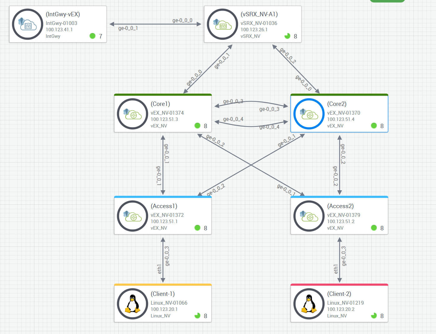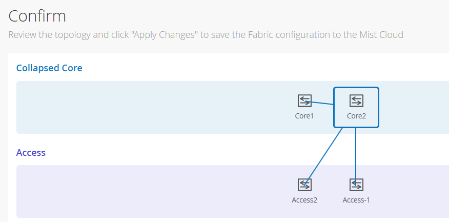This is a Mist managed EVPN VXLAN Campus Fabric lab setup. The core and access layer switches are configured, managed and monitored using Mist Cloud.