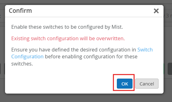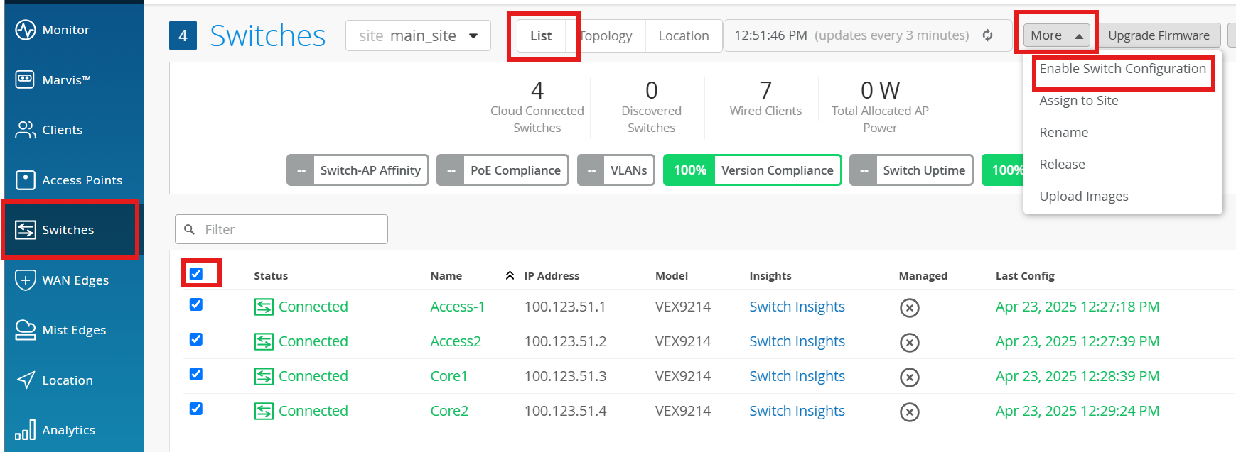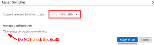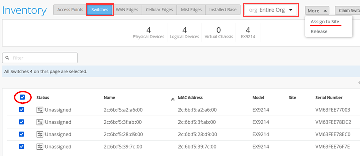 The switches will be adopted to the mist org by automation on setup. We need to assign the adopted switches to the site. On Mist Org: