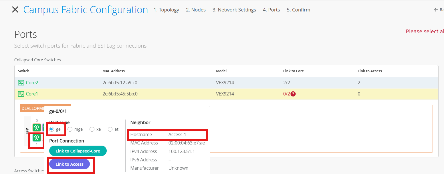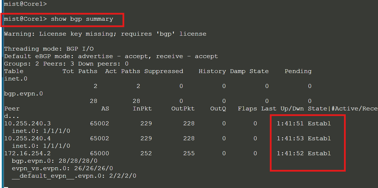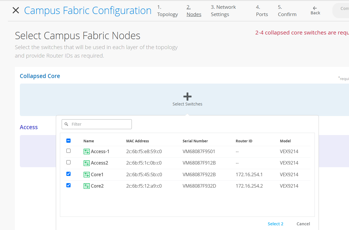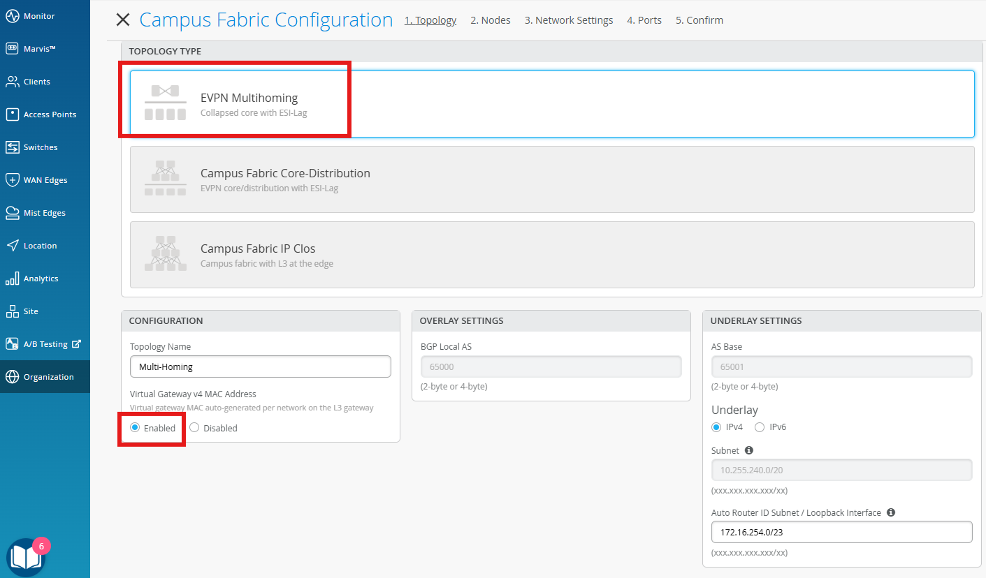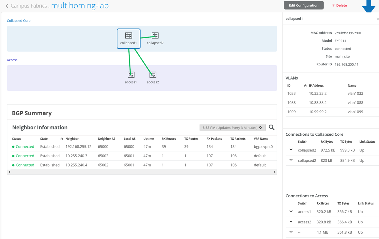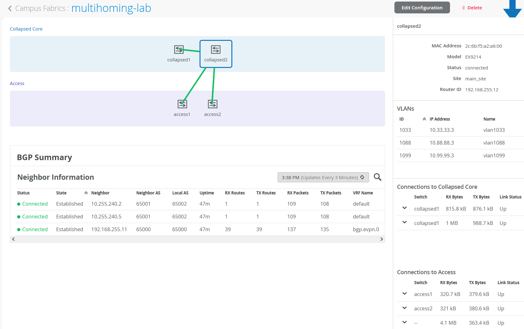 Mist Wired Assurance provides the user with Realtime status related to the health of the Campus Fabric EVPN Multihoming deployment using telemetry such as BGP neighbor status and TX/RX port statistics. The following screenshots are taken from the Campus Fabric EVPN Multihoming build by accessing the Campus Fabric option under the Organization/Wired of the Mist Portal: