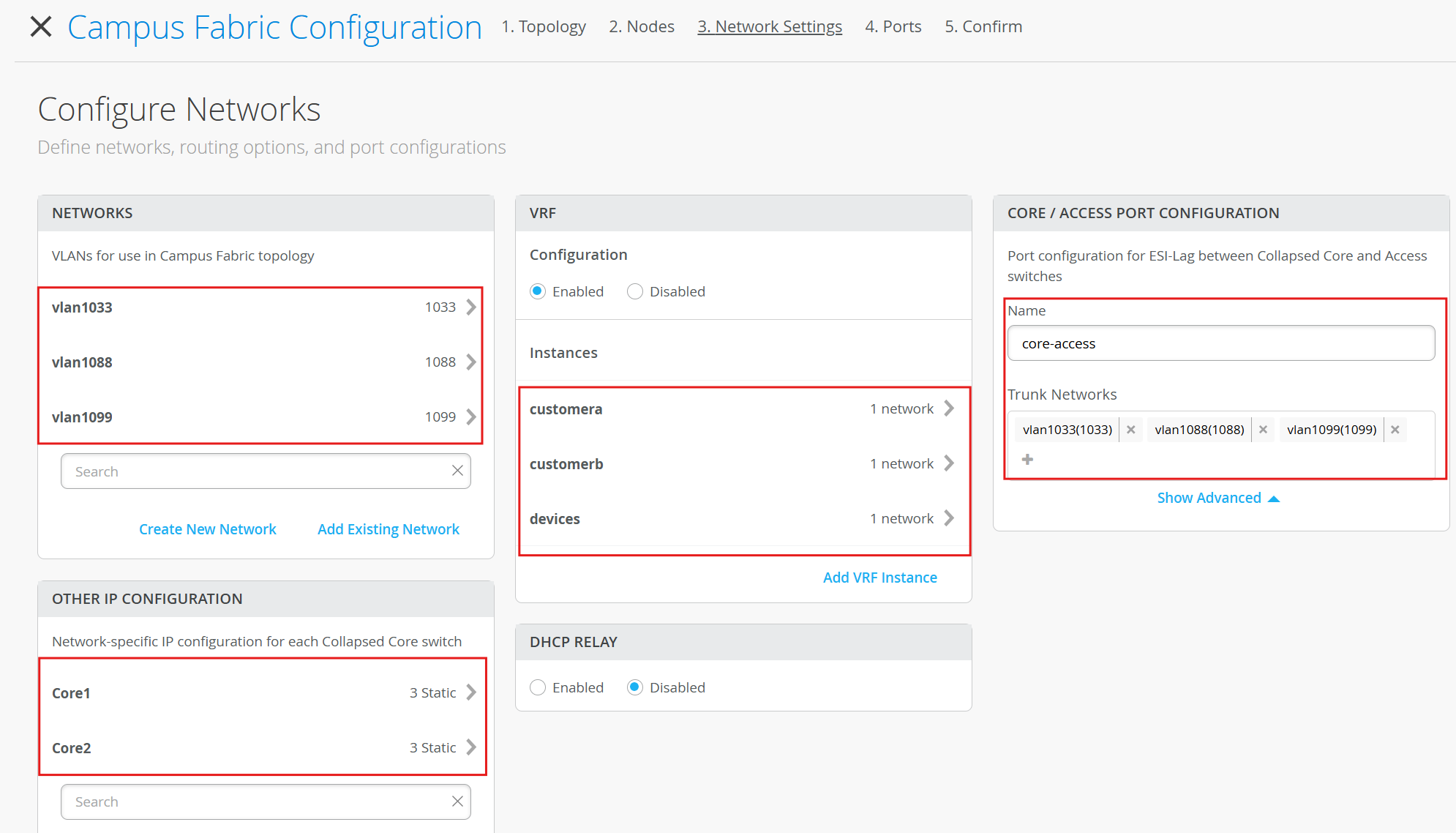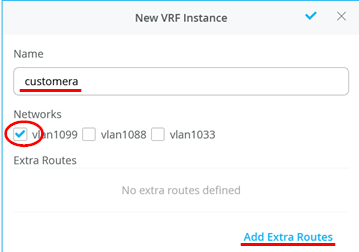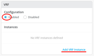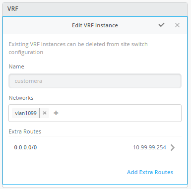 For L2 exit, we must define a default route towards gateway present on the external WAN router attached (MX in this lab). Add the following VRF Instances: