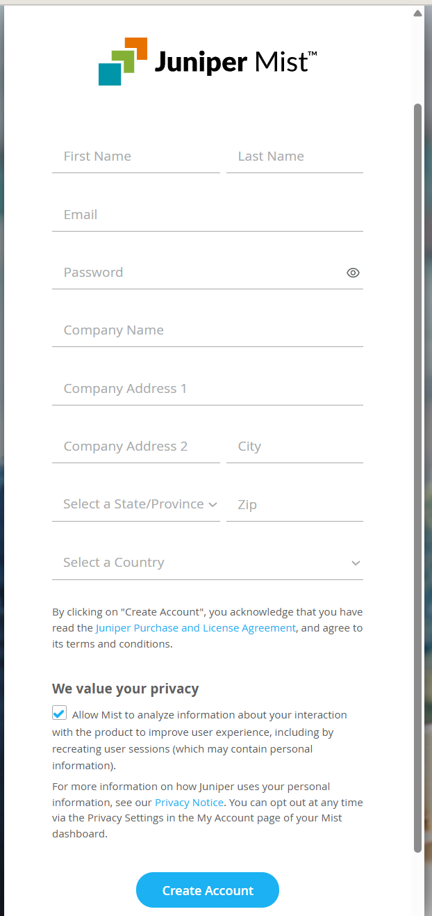 Sign up to create a Mist account at this URL: [https://manage.mist.com/signin.html#!signup/register]
