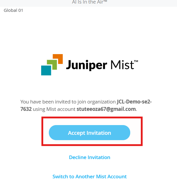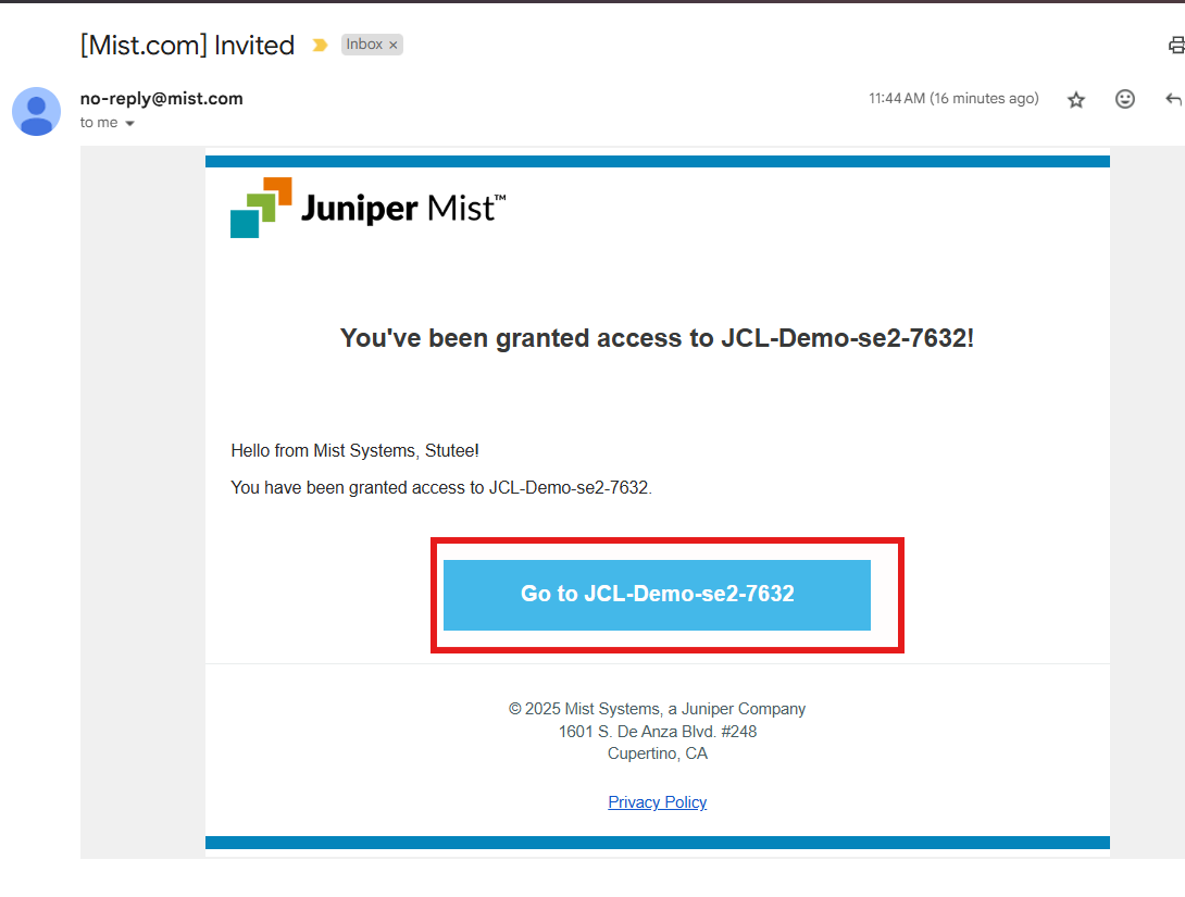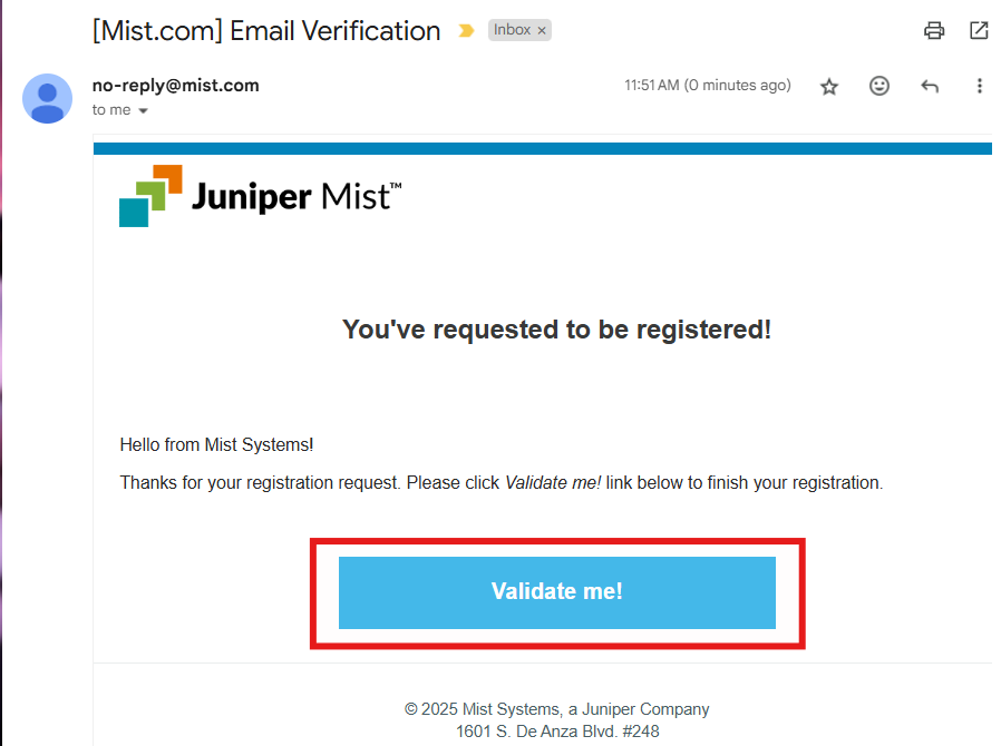 You’ll receive an email invite from [no-reply@mist.com] to a Mist Org to validate your account.