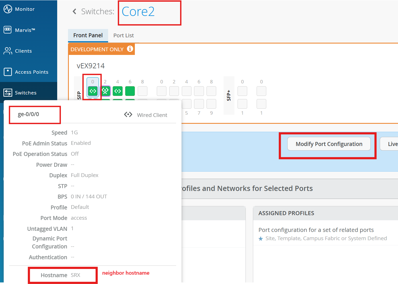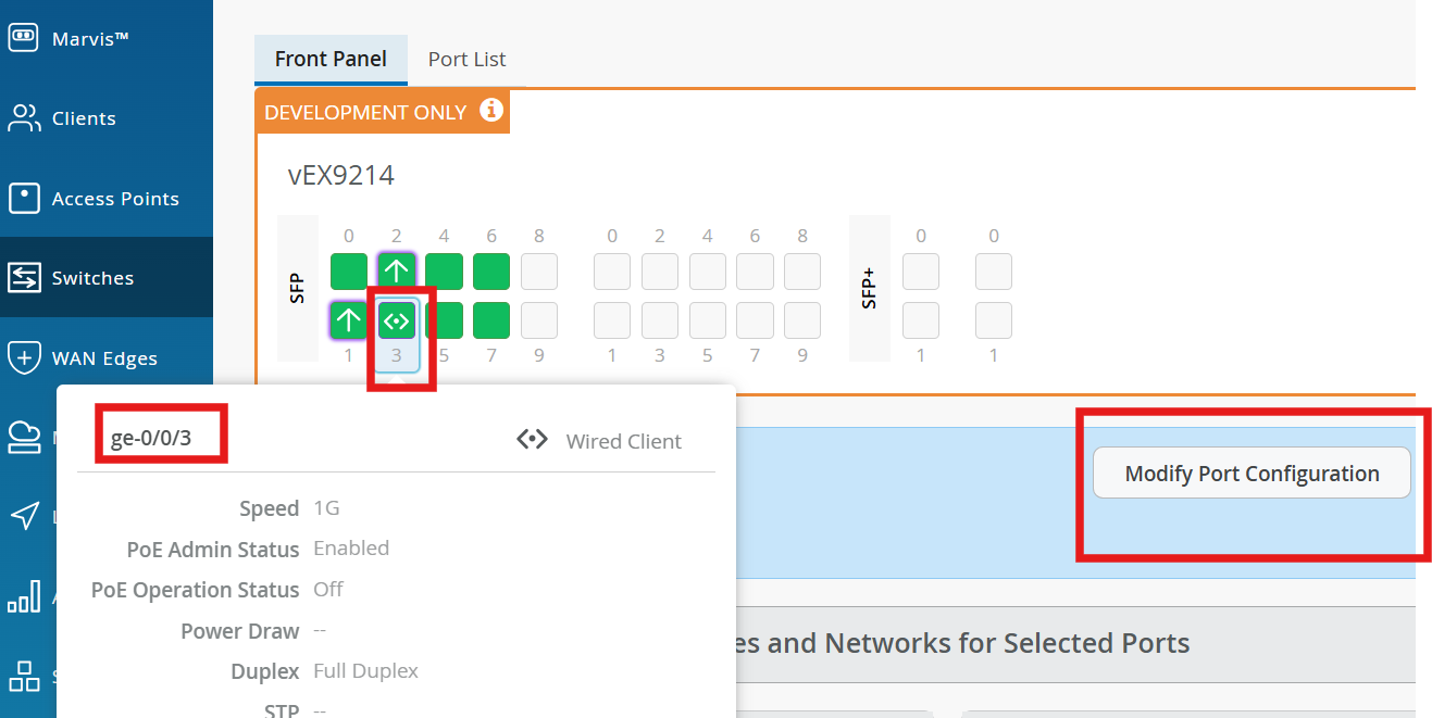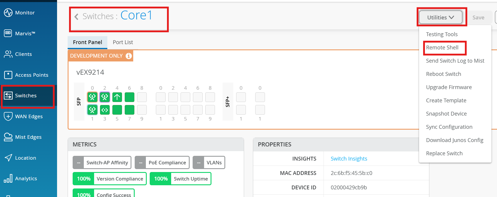 From this view, Mist also provides remote accessibility into each device’s console through the Remote Shell option as well as rich telemetry through the Switch Insights option. Remote Shell has been demonstrated throughout this document when displaying real time operational status of each device during the verification stage.