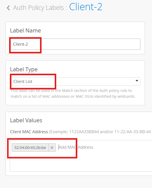 Label Value - Client-2’s eth1’s mac address (example: 00:50:56:be:9b:99)