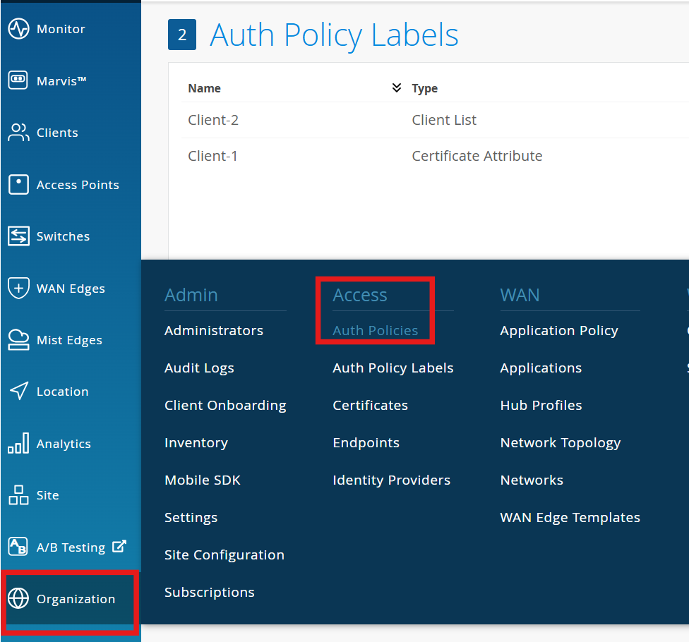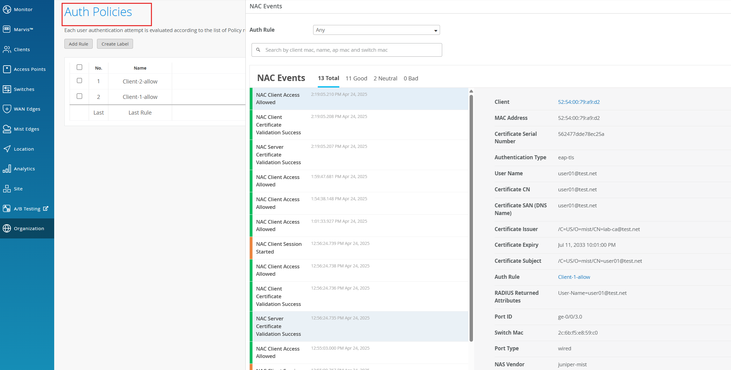 MIST NAC option allows users to configure authentication policies and authentication labels to allow/deny traffic.
