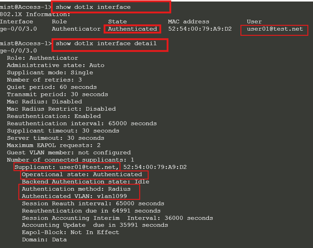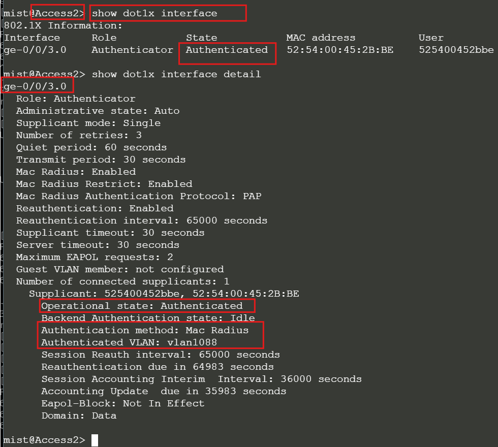 Wait a minute and check the dot1x status on Access-2 using remote shell